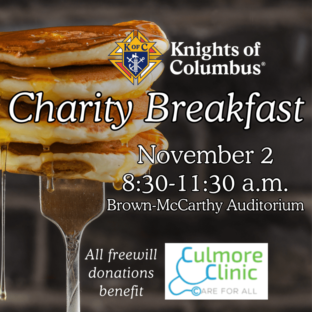 Join us for the next Knights of Columbus Charity Breakfast on Sunday, November 2 starting after the 7:30 a.m. Mass until 11:30 a.m. in the Auditorium. All freewill donations benefit Culmore Clinic, a nonprofit, faith-based healthcare organization that provides free, compassionate, and inclusive medical care, counseling, and specialty referrals to uninsured adults in the Falls Church area.