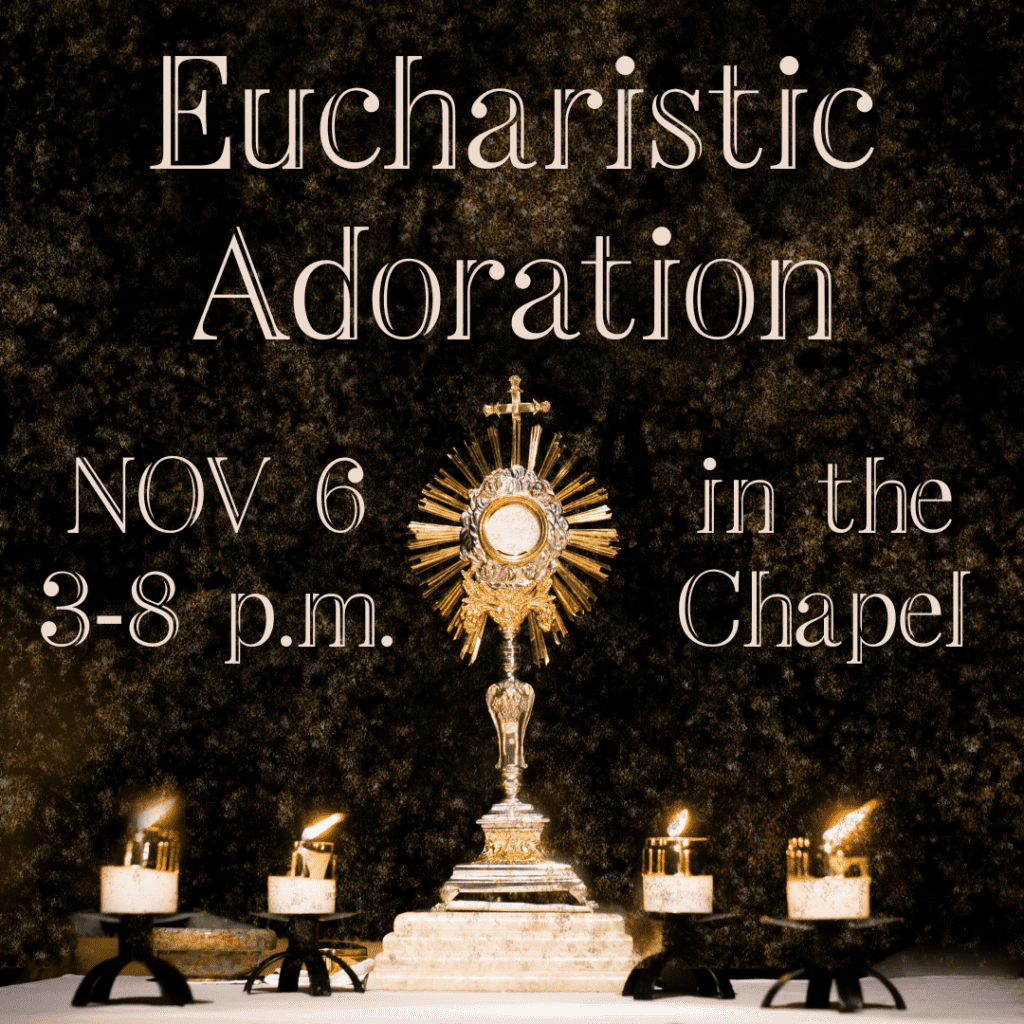 Please join us for our monthly Eucharistic Adoration on Thursday, November 6 from 3 p.m. to 8 p.m. in the Chapel. Come adore the Lord.