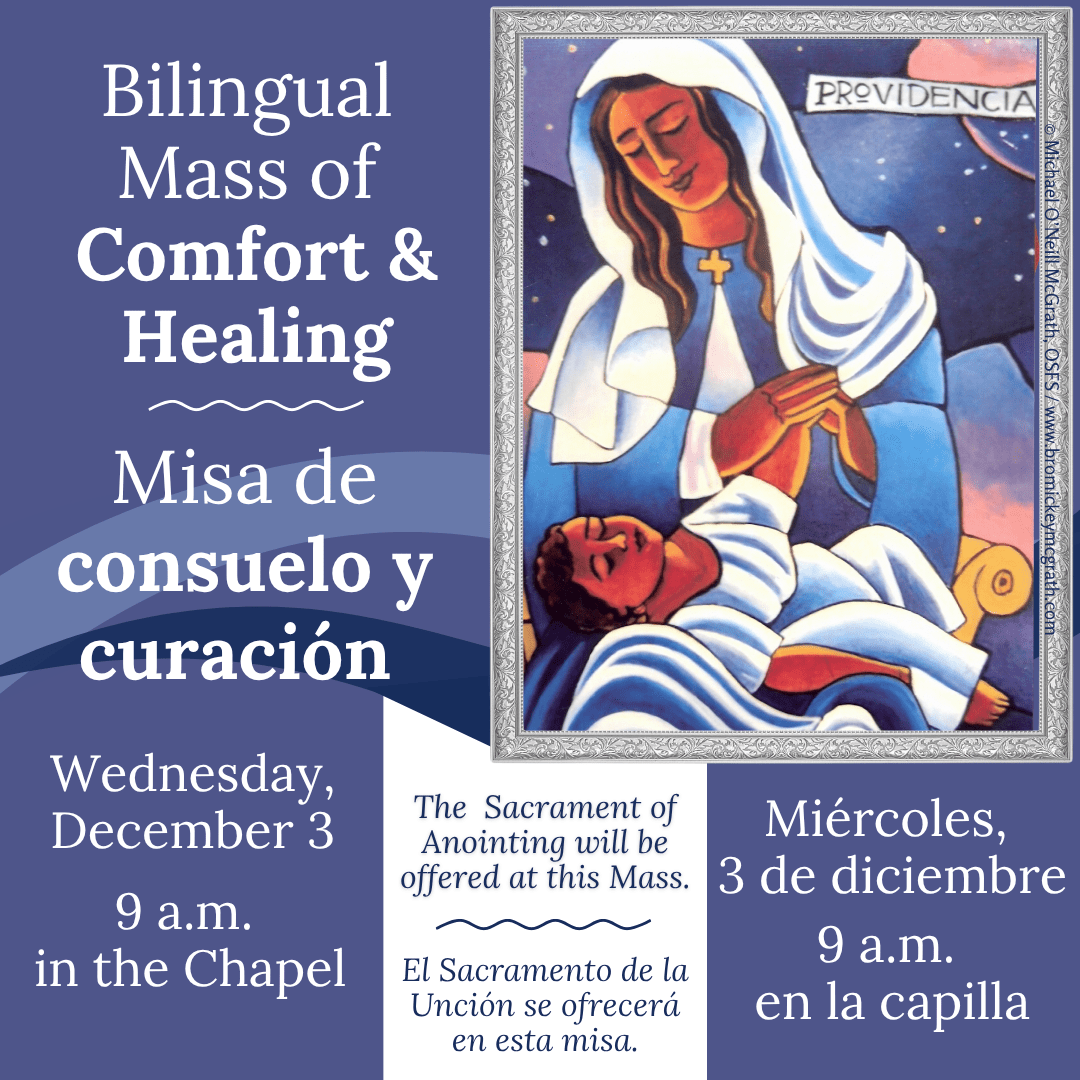 Please join us on Wednesday, December 3 at 9 a.m. in the Chapel for our Bilingual Mass of Comfort & Healing. The Sacrament of Anointing will be offered at this Mass.