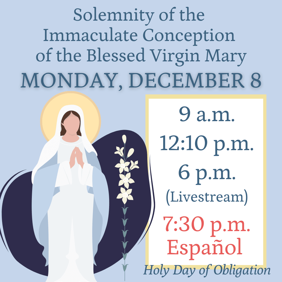 9 a.m., 12:10 p.m., 6 p.m. (livestream), and 7:30 p.m. (Spanish)