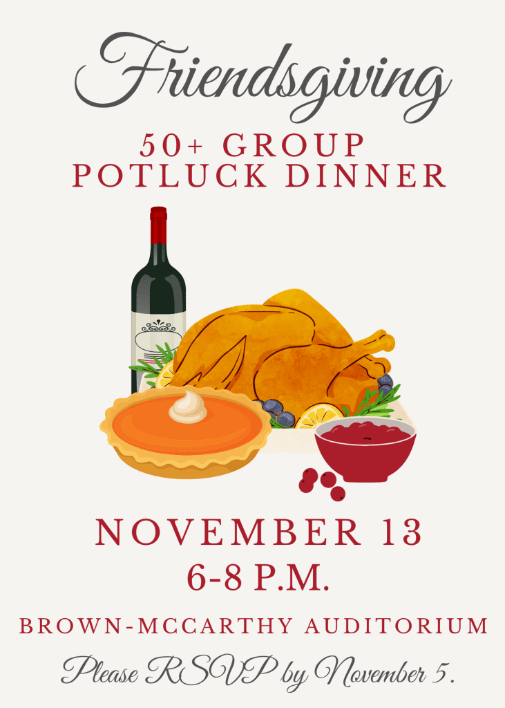 50+ Group, old and new friends, you are invited to join us for our Friendsgiving Potluck Dinner. We will gather this Thanksgiving season to enjoy food, fun, and fellowship in a spirit of gratitude.