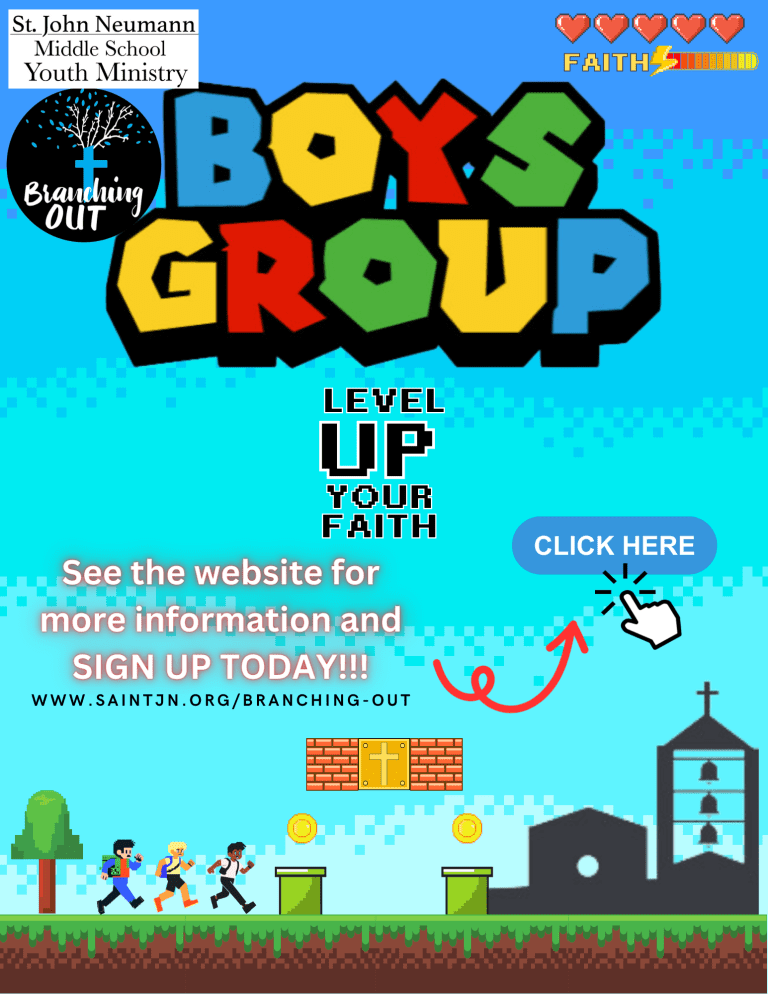 Boys Group meets regularly (about twice a month) to grow in faith and friendship. Boys meet on-site and do various outings throughout the year. Boys with busy schedules who may need to miss frequently are strongly encouraged to still join us when able!