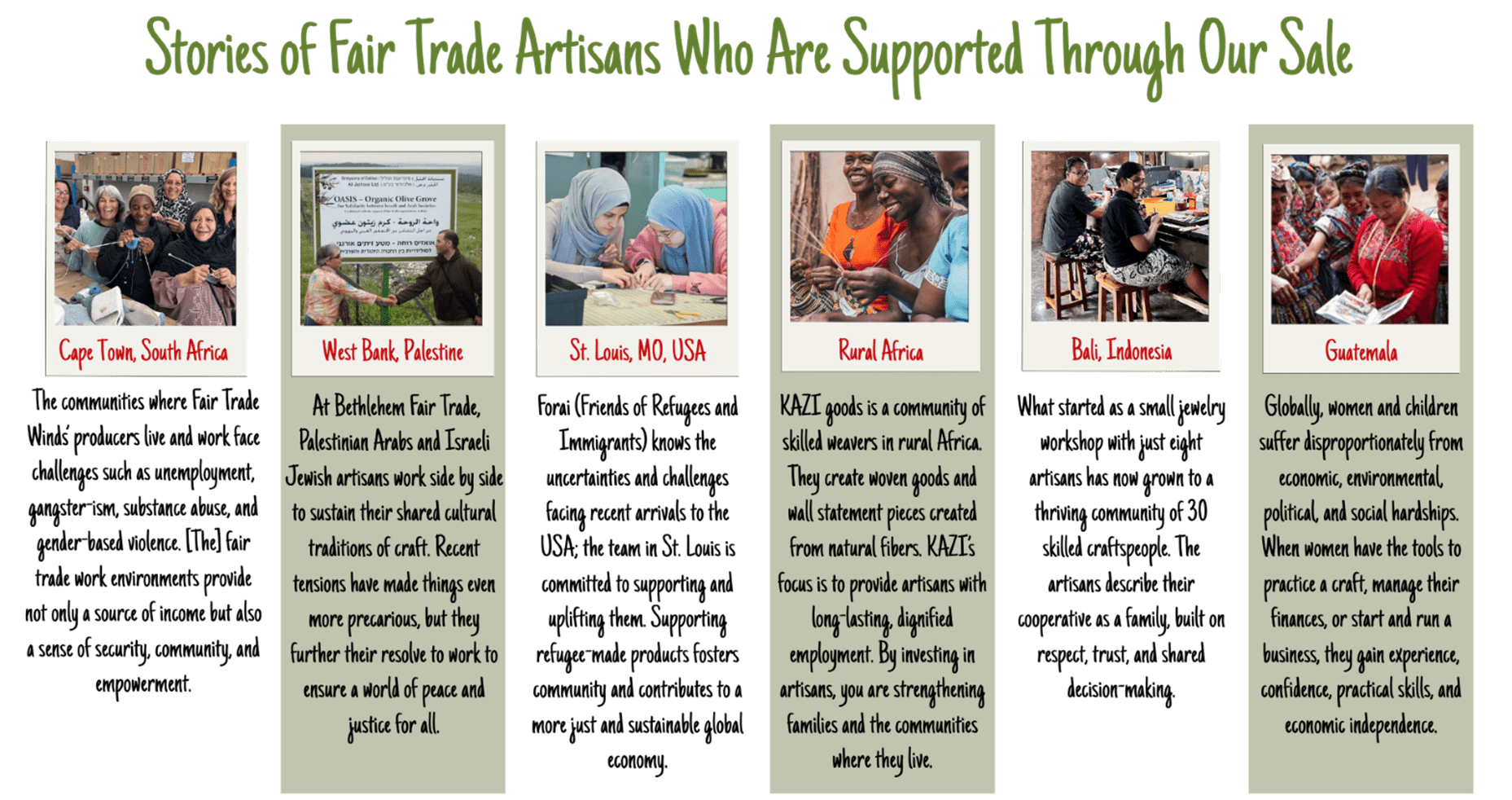 The annual Fair Trade Sale will be held after all Masses over the Thanksgiving weekend in the Brown McCarthy Auditorium. In addition, the shop will be open all day Sunday from 8 am-7 pm. A wide variety of handmade products from Fair Trade Winds will be available. Purchasing high-quality Fair Trade products empower impoverished but talented artists and their communities to live with dignity and to preserve their crafts.