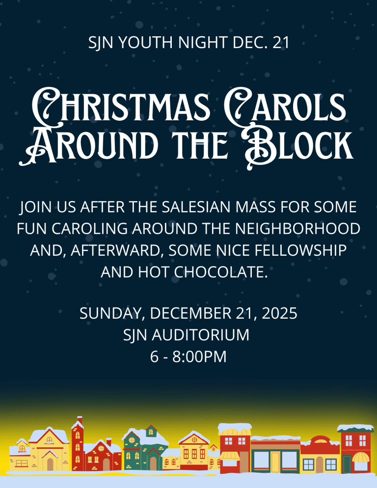 Our Salesian Youth Mass takes place at the 5 p.m. Sunday Mass on specific Sundays each month. At the end of Mass, a teen gives a reflection on a Salesian virtue, and teens are invited for dinner and fellowship proceeding Mass.